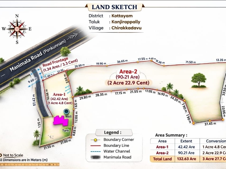 This is a premium highway (SH-8) frontage property in the fast-developing region of Chirakkadavu, located on Ponkunnam–Manimala Road (SH-8). This strategically positioned 3-acre property offers excellent visibility, accessibility and immense development potential for both residential and commercial purposes.